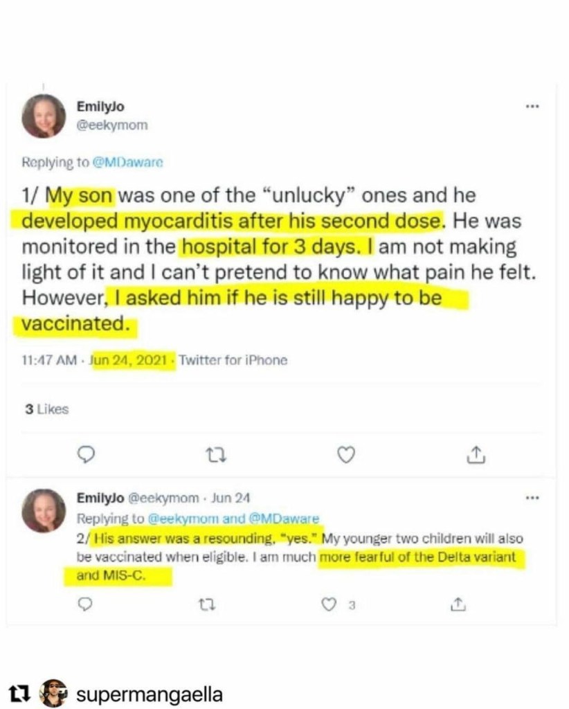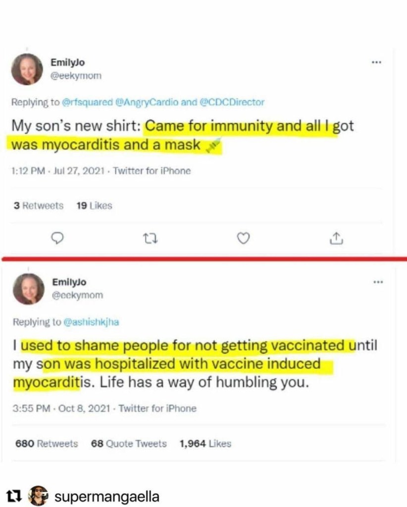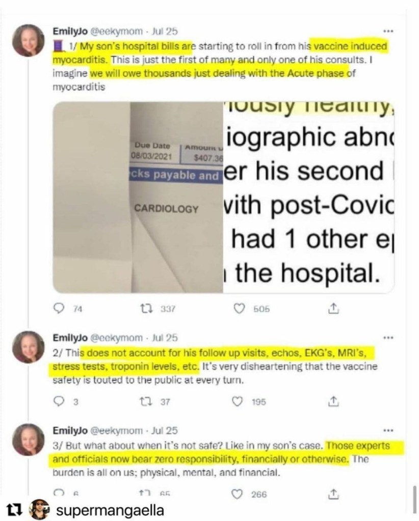 “A teacher with “a few science degrees” who was chomping at the bit to get all three of her kids jabbed has a change of perspective after her son gets life debilitating heart issues and has to foot the bill herself. Very interesting to see her journey of becoming humble here. Poor kid.”