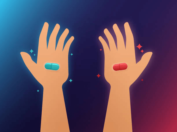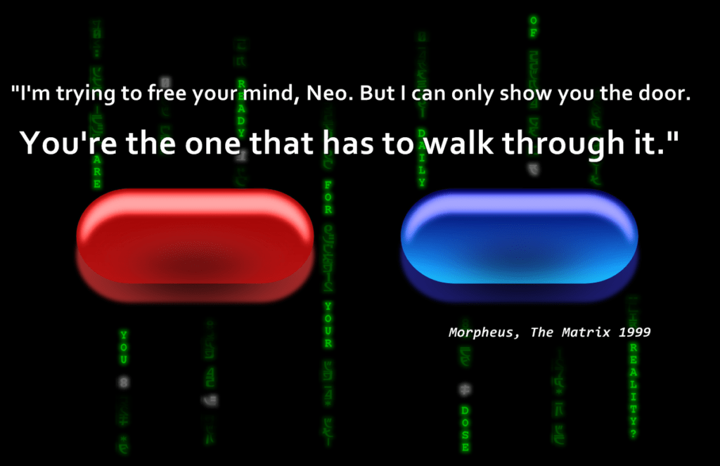 It originates from 1999 film “The Matrix,” ironically written and directed by two transgender women, in a scene where the protagonist is offered a choice between a literal blue pill to “wake up…and believe whatever he wants to believe” and a red pill to “stay in Wonderland, …be shown deep the rabbit hole goes,” and join a rebellion against the simulated reality he lives in. The red pill itself is believed to have been been modeled after red Premarin-brand tablets, popular as estrogen-boosting medication for transgender women in the 1990s.