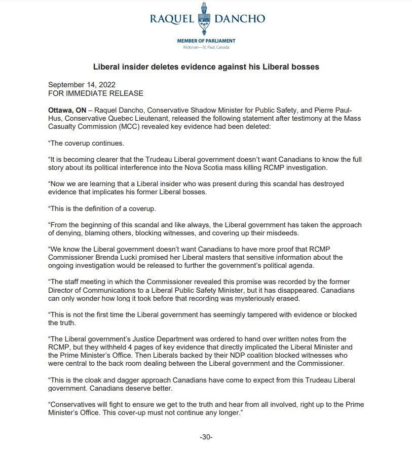 Conservative MP Raquel Dancho issues press release disclosing that a Lie-beral worker for one of the politicians deliberately destroyed evidence surrounding the allegations of political pressure on RCMP Commissioner Brenda Lucki. This is yet another crime folks, do you think anyone will be arrested?
