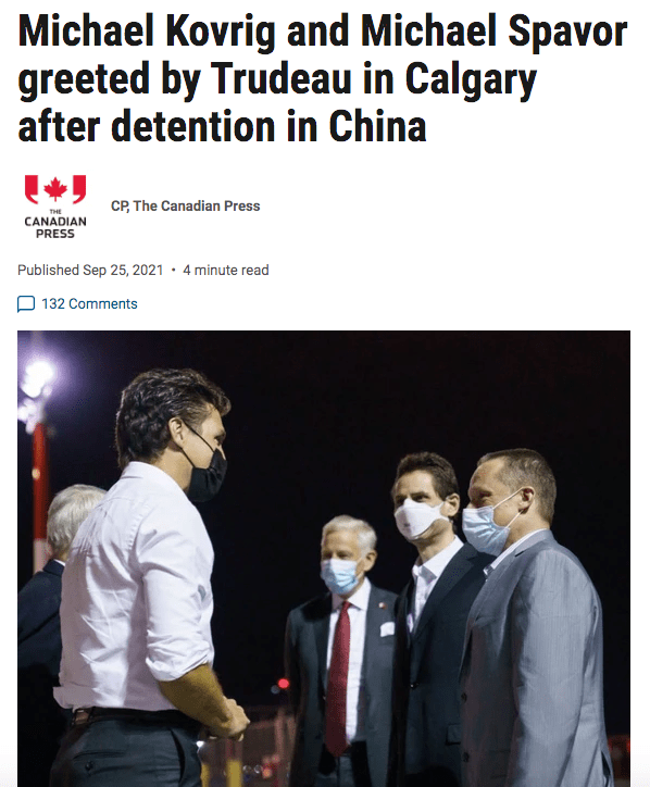 JFT meets the two Michaels upon their return to Canada after over 2 years in Chinese jails…a sentenced allegedly LENGTHENED for political reasons–at the request of the Turvertian government!