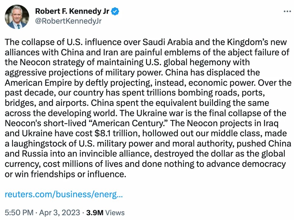 UPDATED: April 6, 2023 Here is a statement from RFK Jr. on Twitter: