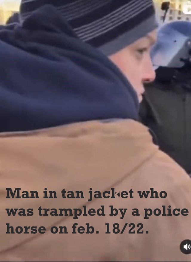 Good Sunday Morning readers. Just a quick update on a story I’ve been following for over a year and a half…the police trampling of two demonstrators in Ottawa during the Trucker Freedom Convoy of January/February 2022. Regular readers will already know the details of this mystery. Two demonstrators were trampled by police horses that day outside the Chateau Laurier in downtown Ottawa. One of them, a woman, ended up in hospital with a broken shoulder, was released and disappeared from the public eye. The other, a man, was more severely trampled as shown in the photo below: