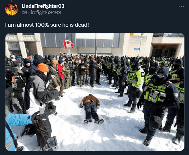 I could understand the government not wanting the topic brought up as I’ve speculated that this man may have been an undercover provocateur inserted into the crowd to add to the mayhem. BUT I CANNOT UNDERSTAND WHY THE CONVOY SUPPORTERS AND/OR THEIR LAWYERS DID NOT BRING UP THE TOPIC AT THE HEARING. This smacks of collusion and I cannot bear it. So, I kept bringing up the topic intermittently since on X. Last night, another Xer brought up the topic. “Heather” started a thread and several Canadians joined in sharing what we knew and thought. As a result of this, a video [linked below] has come to light were a doctor who was present at the demonstration on February 18, 2022 was being interviewed afterwards and he told the interviewer that he is “1000% sure the man died of his injuries within a year of that day.” Please check the two links from X copied below and I will have concluding comments to follow: