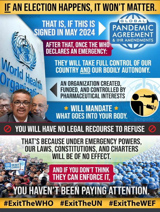 Apparently a UN document is supposed to be signed/ratified/activated in May, 2024 which will allow the UN to come and pull you out of your home and put you into a concentration camp if you refuse to take the NEXT toxic concoction they have planned to inject into you. Are you aware/ready for this?