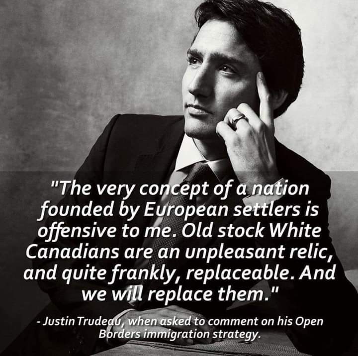 *See image at the end of this post for a description of who the “Old Stock European Settlers” are that Trudeau is desperate to replace with millions of illegal, unvetted third world migrants”–all brought in at taxpayer expense.