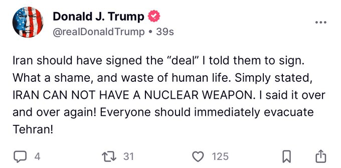 Just a brief update Folks. I’m watching the feed on this war by the minute and it’s getting way out of hand…while the Orange fucker is in Canada no less…demanding just moments ago that “everyone evacuate Tehran”. This is definitely WWIII and he would like nothing more than to have declared it from Canada. I said they never should have let him in here.