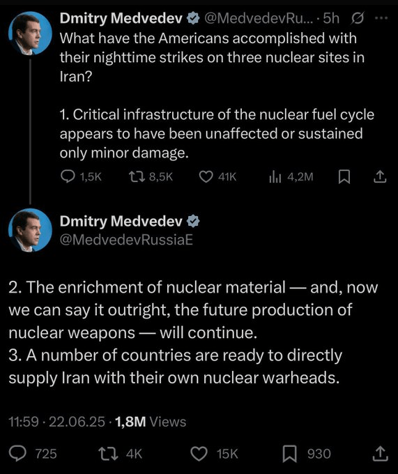The financial consequences for Americans? Eventually, devastating. Everyday, one out of every five barrels of oil flows through the Straits of Hormuz. Washington spent six months bombing the Houthis. Then, Washington threw in the towel. Walking away from war with Iran won’t be so easy. Russian Prime Minister Medvedev warned that many countries are now willing to transfer nuclear technology to Iran. Simple rule. Countries with nuclear weapons don’t get bombed. Look at North Korea. Countries without them? They get bombed. Iraq. Libya and, now, Iran prove it. This is the universal lesson for the world beyond America’s borders.
