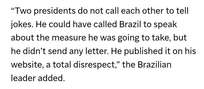 Brazil President Lula da Silva yesterday, after finding out that Trump was levying 50% tariff on Brazil without any discussion with him beforehand:
