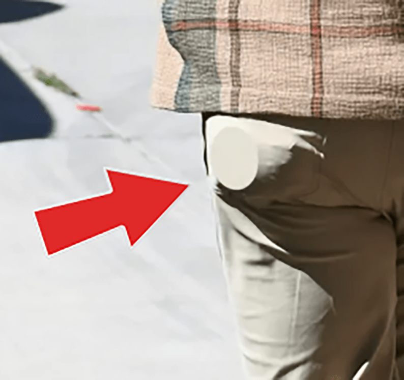 | This is a no-brainer! There it is…the contemporary high tech version of an 1890s palm pistol right in his left back pocket! Ooops! The round part is the magazine and to the right appears to be the tip of the barrel which is about an inch and a half long. Or, it may be part of the trigger mechanism. See photo below. |