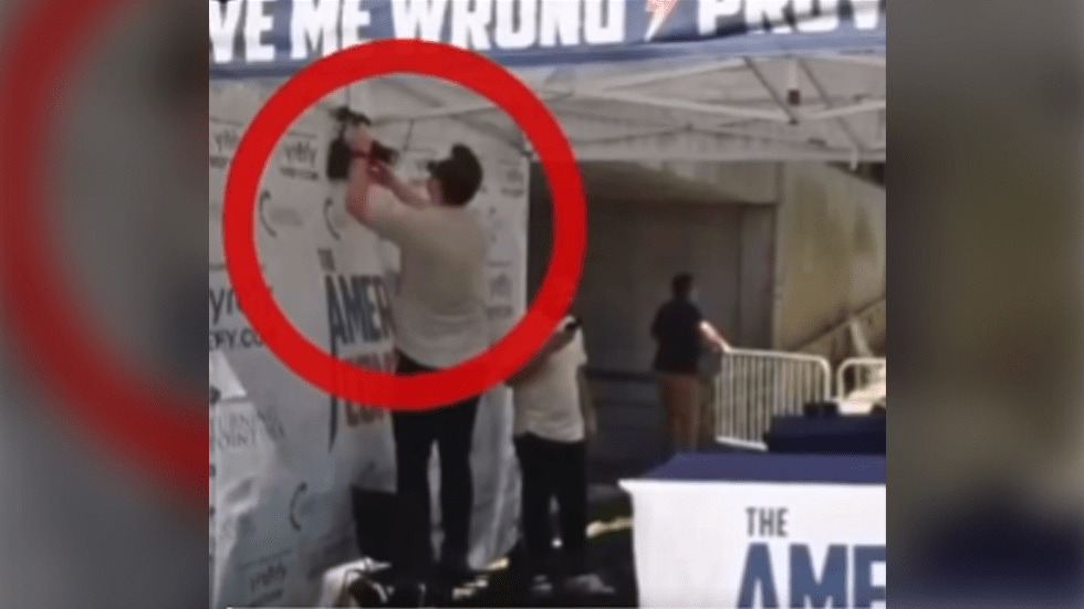 Moments after Charlie Kirk was shot, a TPUSA employee was filmed removing a security camera mounted right behind where Kirk had been sitting. The employee stood on the chair on which Kirk had been sitting to reach the camera.