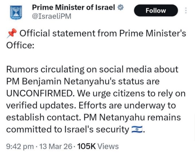 UPDATE: March 13, 2026 – From SuliamanAhmed If this is real. Where is Netanyahu?