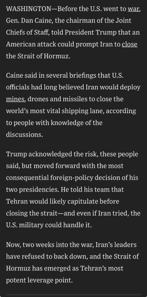 NEW: Gen. Caine briefed Trump several times that an American attack could prompt Iran to close the Strait of Hormuz.