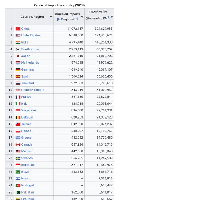 Greencrow comments: Below is a chart showing what a liar Trump is and how up the creek the US is. It is a chart showing how much crude oil the US imports. Remember how Trump bragged that the US has its own oil? The US is second only to China!