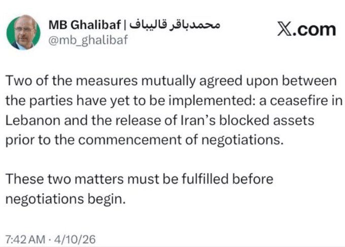 Events are moving with lightning speed in this evolving crisis. This morning Iran was not willing to negotiate unless all the 10 items that Trump accepted on Tuesday night were officially recognized by the US. This must just have happened because now the delegation is in Islamabad, Pakistan. Below are the links reporting where Iran refused to engage with the negotiator assassinating Americans. All links are from the X account of Suliaman Ahmed–my primary source throughout this crisis. I must acknowledge how great Suliaman’s reporting has been. The best war reporting I have ever followed!