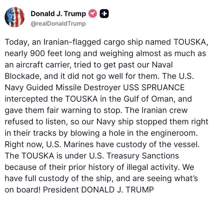 JUST IN: TRUMP CLAIMS US MILITARY SEIZED AN IRANIAN VESSEL IN GULF OF OMAN